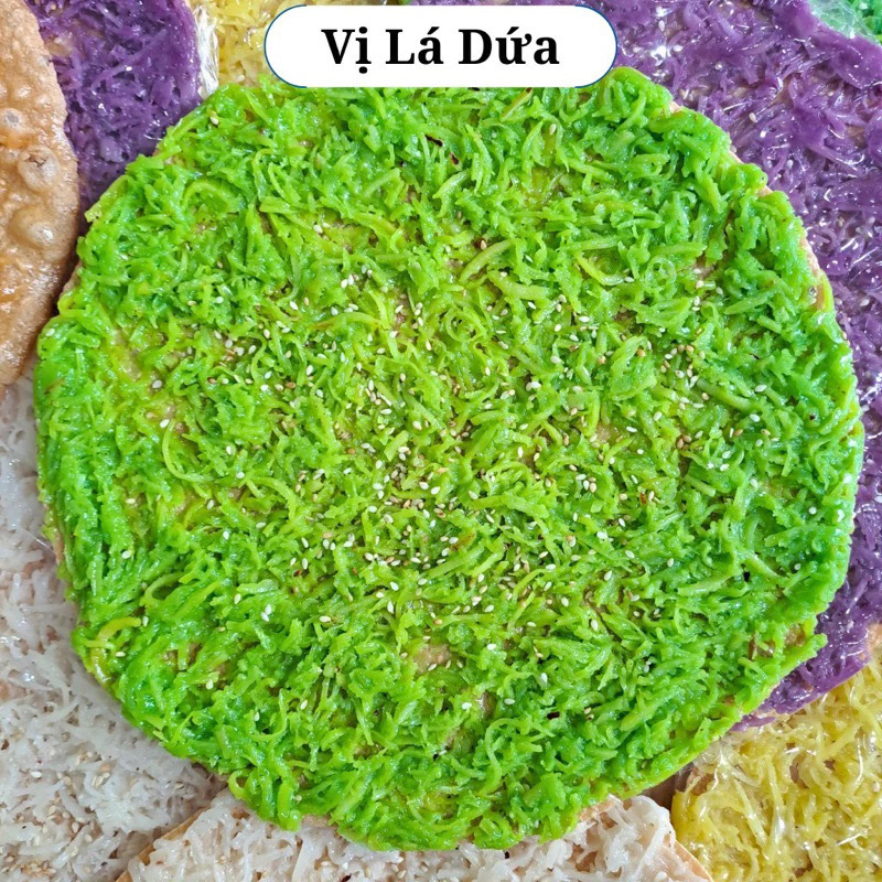 ☘ Bánh tráng dừa vị lá dứa truyền thống với lớp bánh tráng mỏng nướng bên dưới, bên trên là những sợi dừa non được bào mỏng. Những sợi dừa non được rim cùng với lá dứa thơm phưng phức, một ít mè rang. Lớp bánh tráng mỏng được nướng giòn rụm bên dưới. Bên trên là lớp dừa sợi bào nhỏ hòa cùng lớp đường với mùi vị lá dứa.